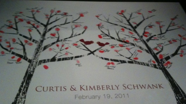 Kimberly and Curtis had one of the coolest things I have ever seen at a wedding reception. They had a large art print that resembled their invitations (which actually had wedding spelled correctly) laid out where everybody walked in. It has a simple white background with woodcut like black tress. They had their guests place red ink on our fingers and then press them on the print to create the leaves of the trees. We were also supposed to sign our names beside our thumbprints. It created a stunning keepsake.